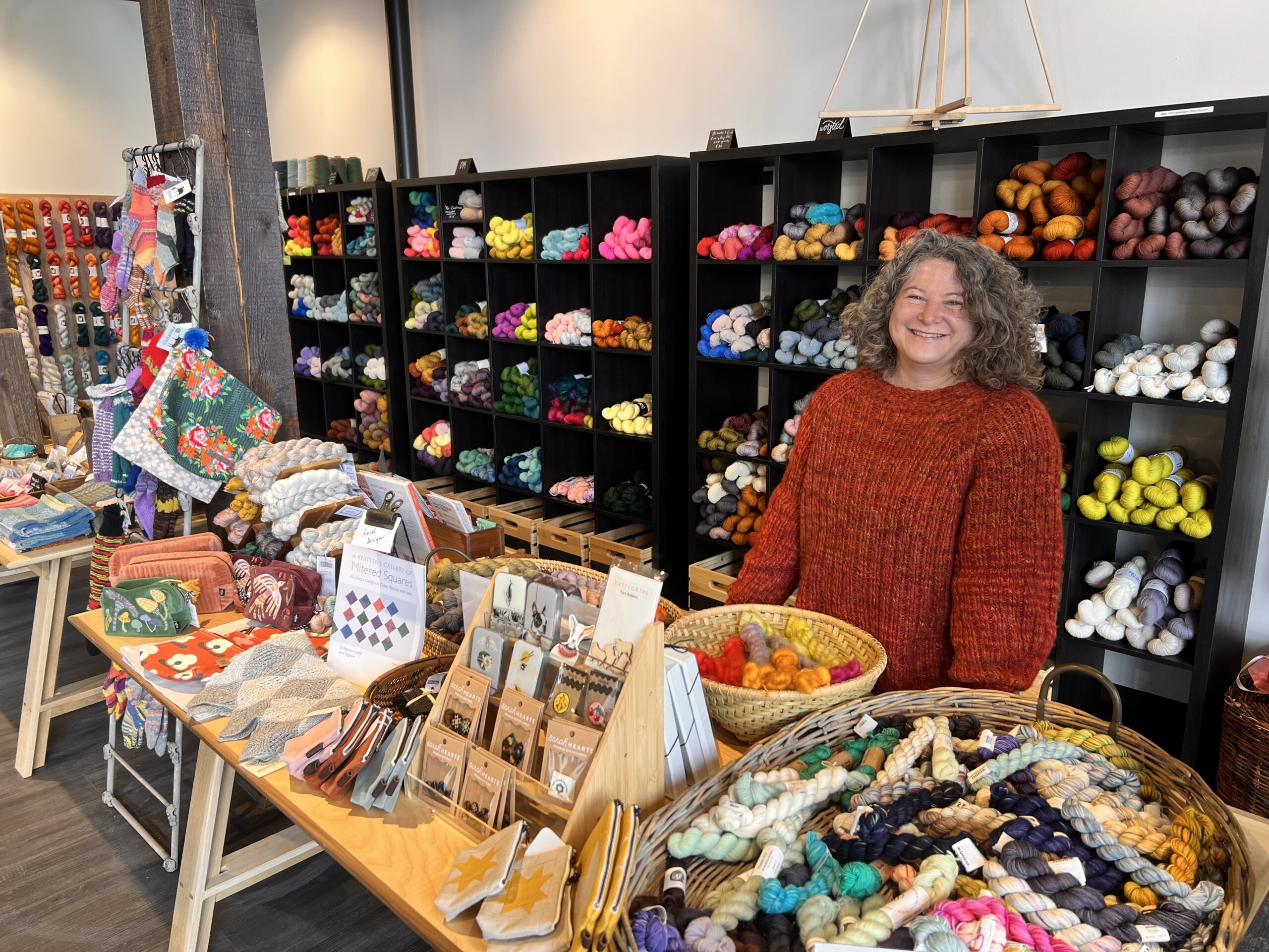 Michigan Fibershed’s Nadine Basile stands in front of hundreds of skeins of yarn at her Boyne City store. She finds her customers are drawn to bright colors in the winter, when the view outside can be kind of drab. Photo credit: Jen DeMoss