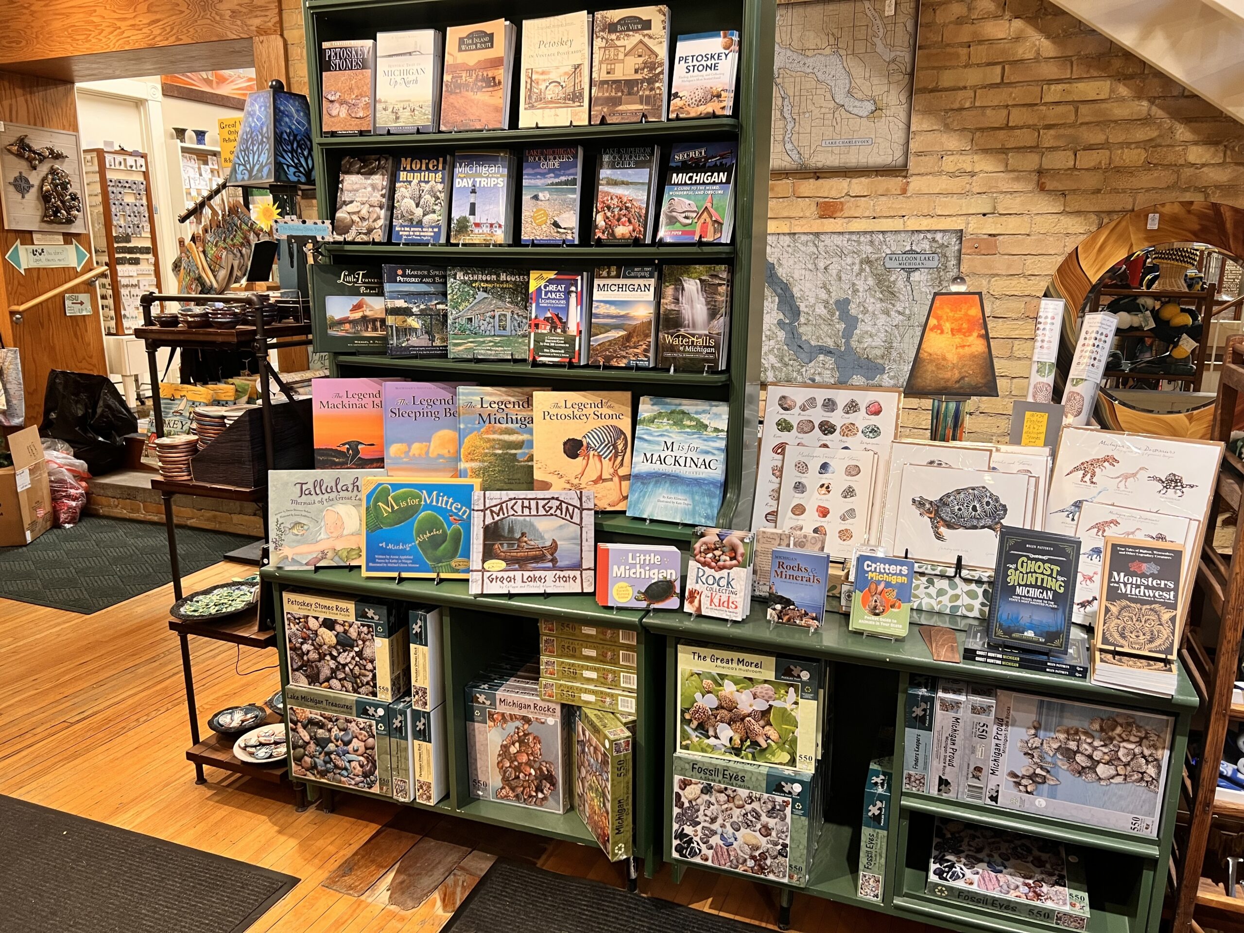 NorthGoods is a great spot to pick up local flair: books on Petoskey stones, morel hunting, waterfalls guides, northern history, and weird Michigan.