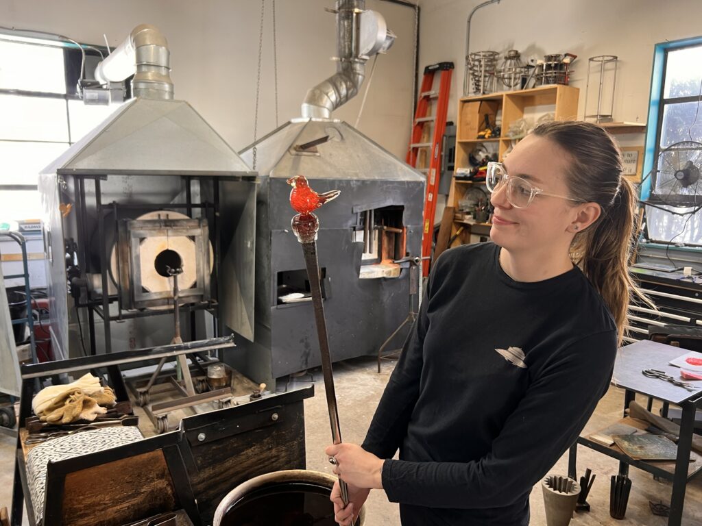 Mary Cash, glassblower at Boyer Glassworks, shows off a bird she’s just shaped from molten-hot glass. The Glassworks carries pieces of all sizes, from small sculptures and ornaments to larger vases and statement pieces, and everything in between. Photo credit: Jen DeMoss