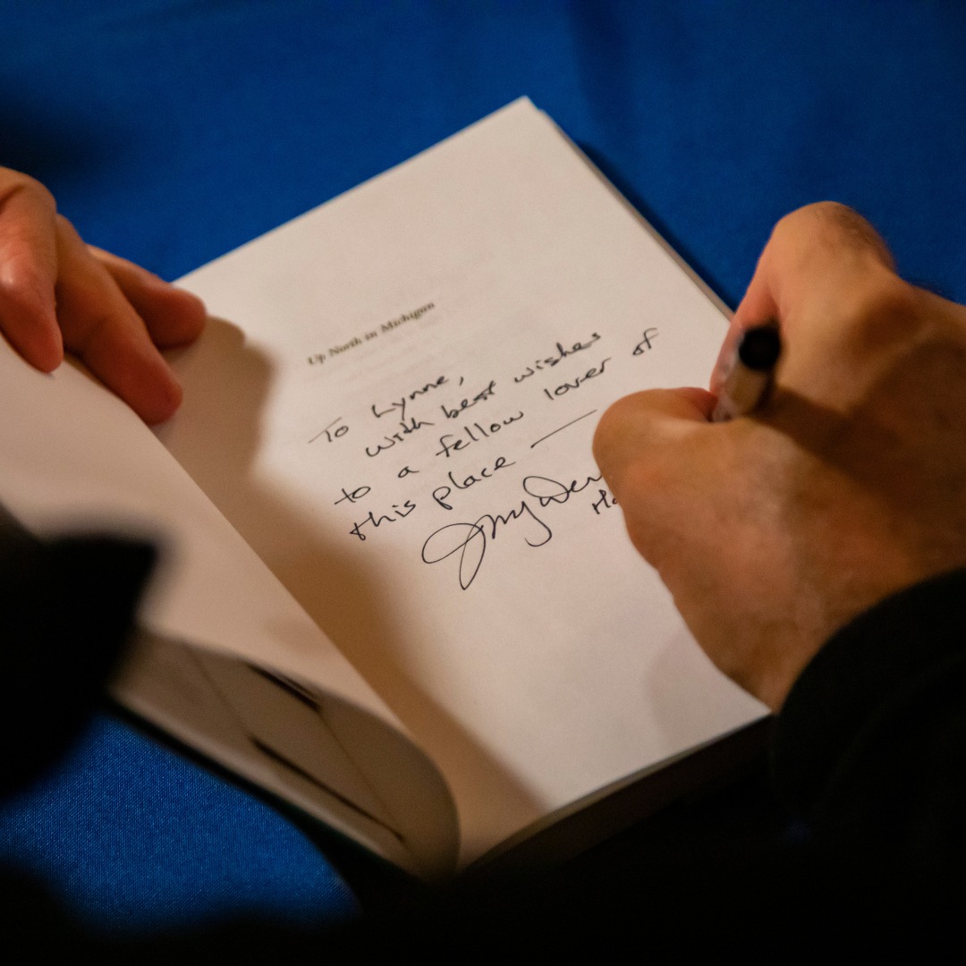 An author signs a copy of their book during the Harbor Springs Festival of the Book. Photo credit Harbor Springs Festival of the Book.