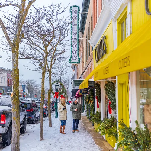 The snow and colder temperatures are seen in the most magical way in the Petoskey Area of northern Michigan. Petoskey, Harbor Springs, Boyne City, Boyne Falls, Alanson, Bay Harbor, and Bay View all make up the Petoskey Area. Come embrace all the fun things to do in the snow – skiing, cross-country skiing and snowshoeing, ice skating, winter tubing and sledding, and fat tire biking. Looking for something a little more low-key? Walk through the snow-decorated streets for shopping, dining, or enjoying a craft cocktail. Take an Enchanted Trail walk or get a sky-high view from SkyBridge Michigan!