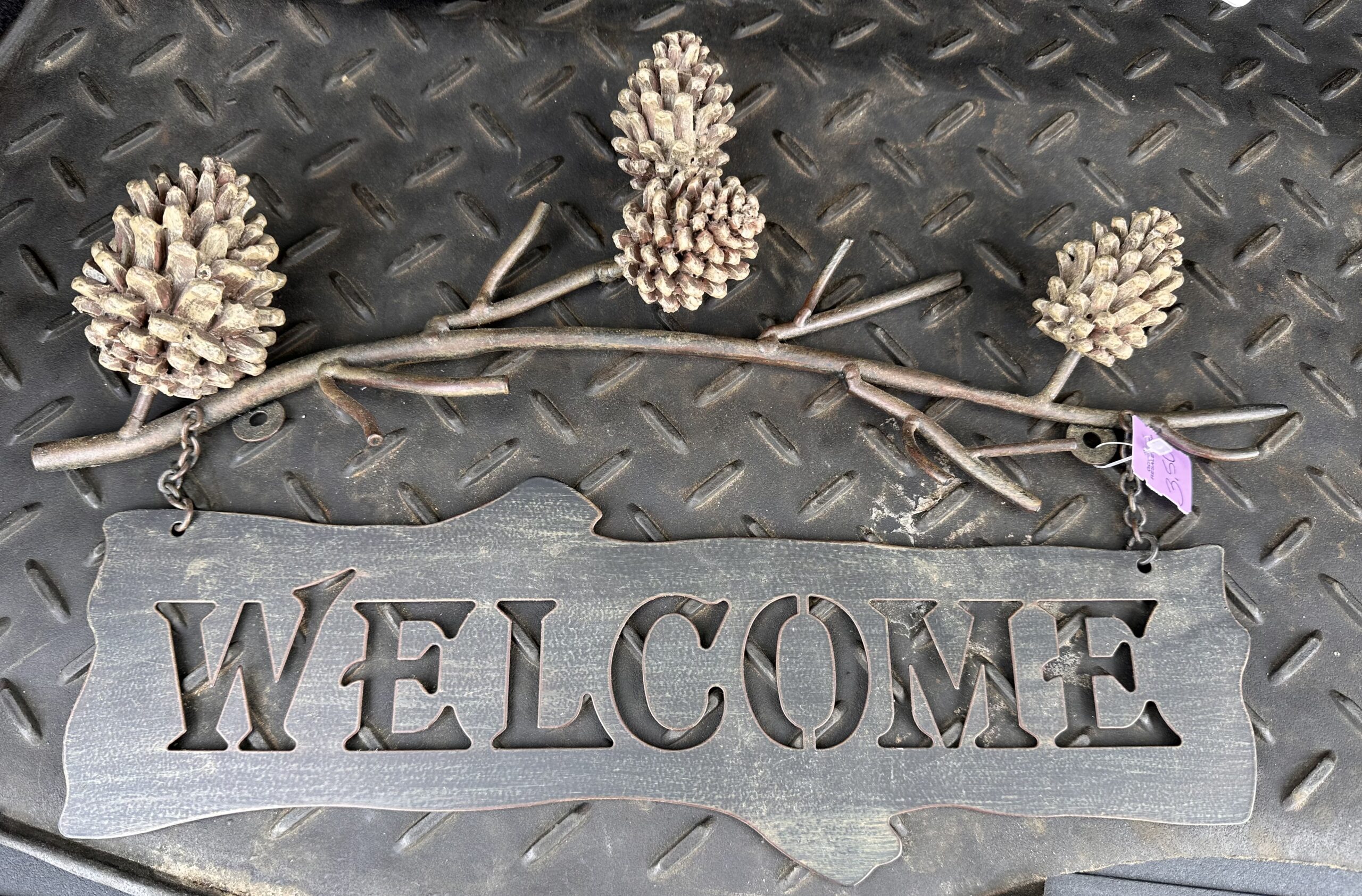 Gold Mine Resale Shop. The Emmet Street location is in a residential neighborhood south of downtown and primarily offers clothing (including semi-formal wear) and accessories, kids’ stuff, and some household items. As this store is in an old house, there is a second story that is not handicap accessible. North of town sits the larger store where you can also find significant furniture sets and pieces—including antiques, as well as paintings and other wall hangings, a good selection of books and DVDs, jewelry, home goods, and clothing—including high-end boutique finds. I’ve been known to walk out with a large bag of treasures from the northern store, but this time I found just one special item—a wrought-iron hanging welcome sign adorned with three pinecones, which totally fits the décor of my log cabin for a mere $3.