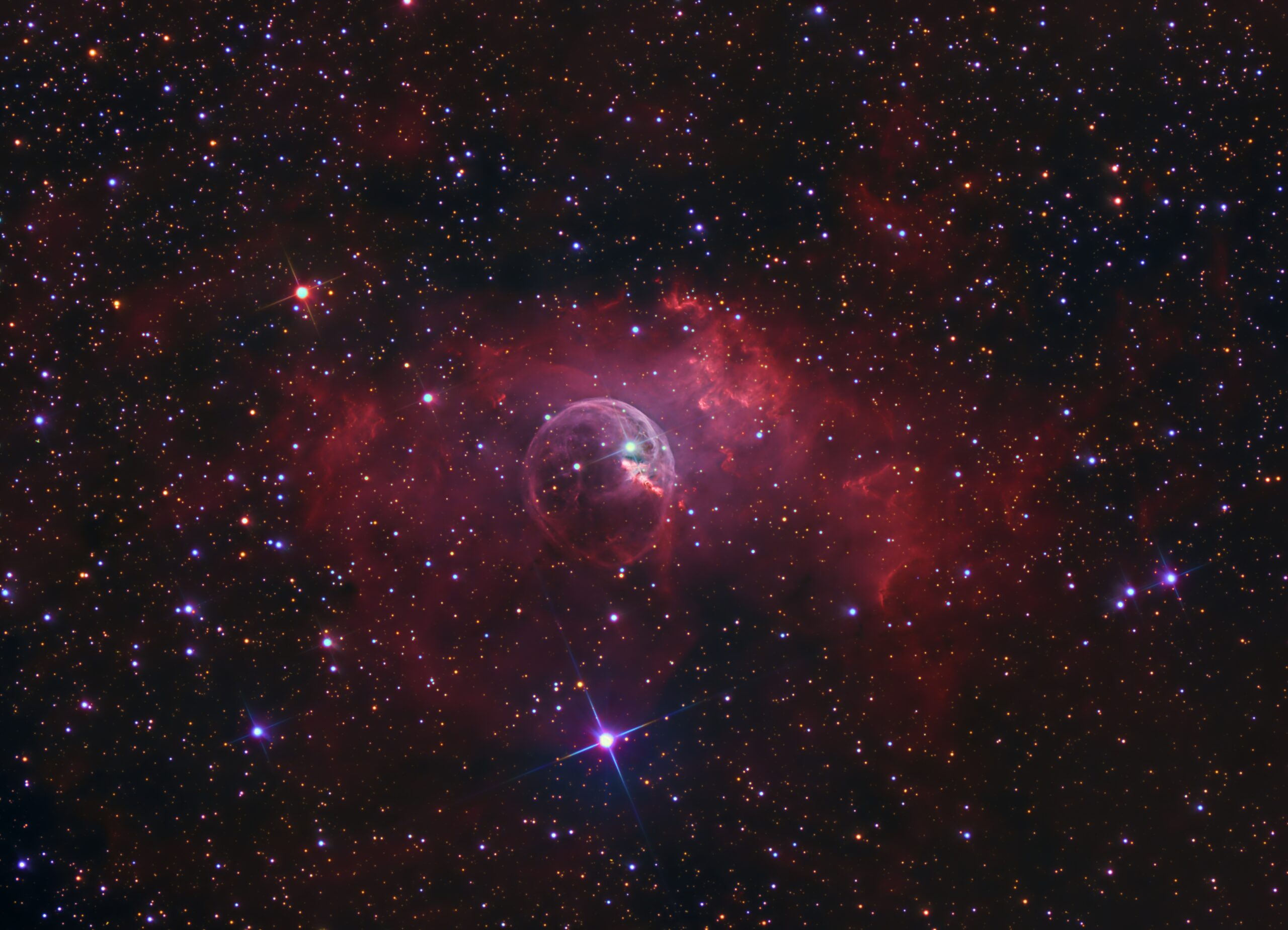 PHOTO CREDIT: Mick Groszko, Northern Michigan Astronomy Club – Bubble Nebula NGC 7635, also known as the Bubble Nebula, Sharpless 162, or Caldwell 11, is located in the constellation Cassiopeia. The “bubble” is created by the stellar wind from a massive hot, 8.7 magnitude young central star, SAO 20575.